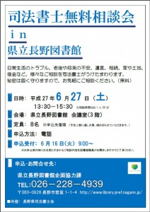 当館では、県民の皆様が抱える課題に対する相談支援の取組として、今年度から長野県司法書士会と連携した相談会を開催します。日常生活のトラブル、老後や将来の不安、遺言、相続、家や土地、借金など、様々なご相談を司法書士がうけたまわります。秘密は固く守りますので、お気軽にご相談ください。(無料)