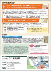 平成27年夏に当館で開催した戦後70年特別企画「発禁 1925-1944 ; 戦時体制下の図書館と知る自由」を機につながりが深まった東京都千代田区立千代田図書館で、このたび下記の展示・講演会が開催されます。