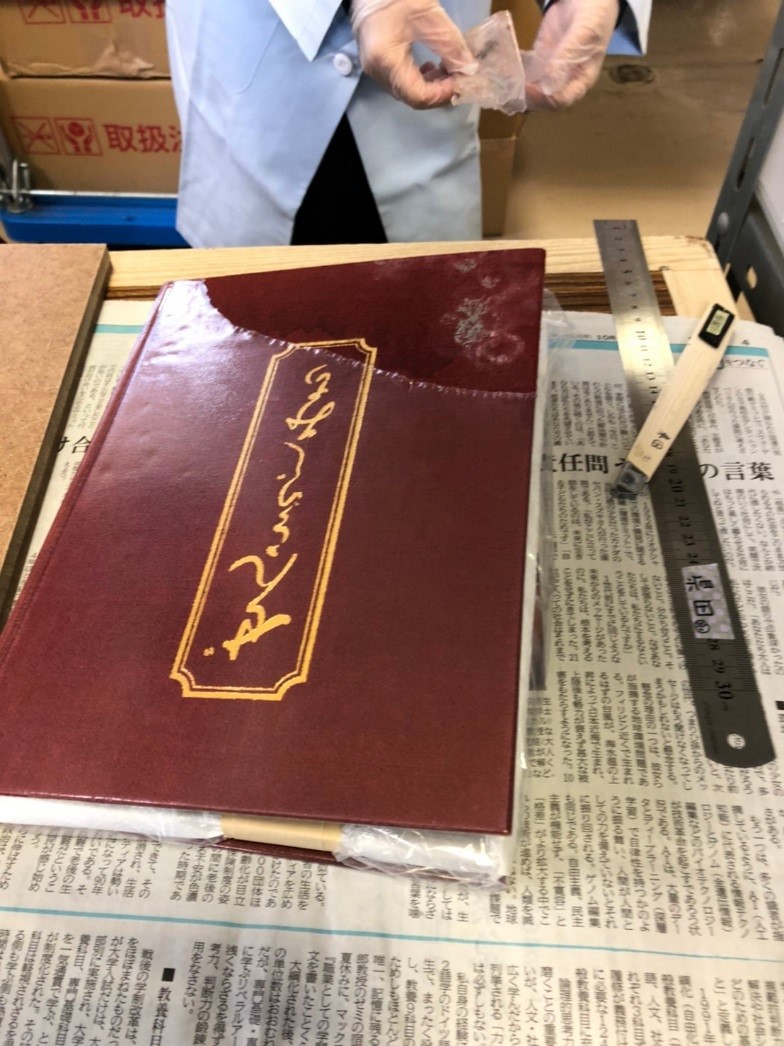 エタノールを使用してカビの除去(本の消毒)を行い、ペーパータオルで乾燥させながら、締め機や重石を使って水濡れによる本の歪みの修正を試みた