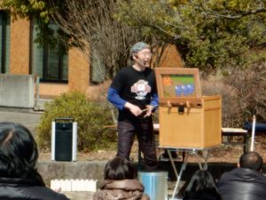 街頭公演では、ぞくぞくと人の集まってくるパフォーマンスを、図書館前の野外広場で展開していただきました。街頭紙芝居のツールを使い、引き出しから小道具を取り出しながら、観客を巻き込んでのあっという間の45分間でした。紙芝居あり、手遊びあり、ジャグリングあり、思わず通りすがりの人が引き込まれる空間が出現しました。